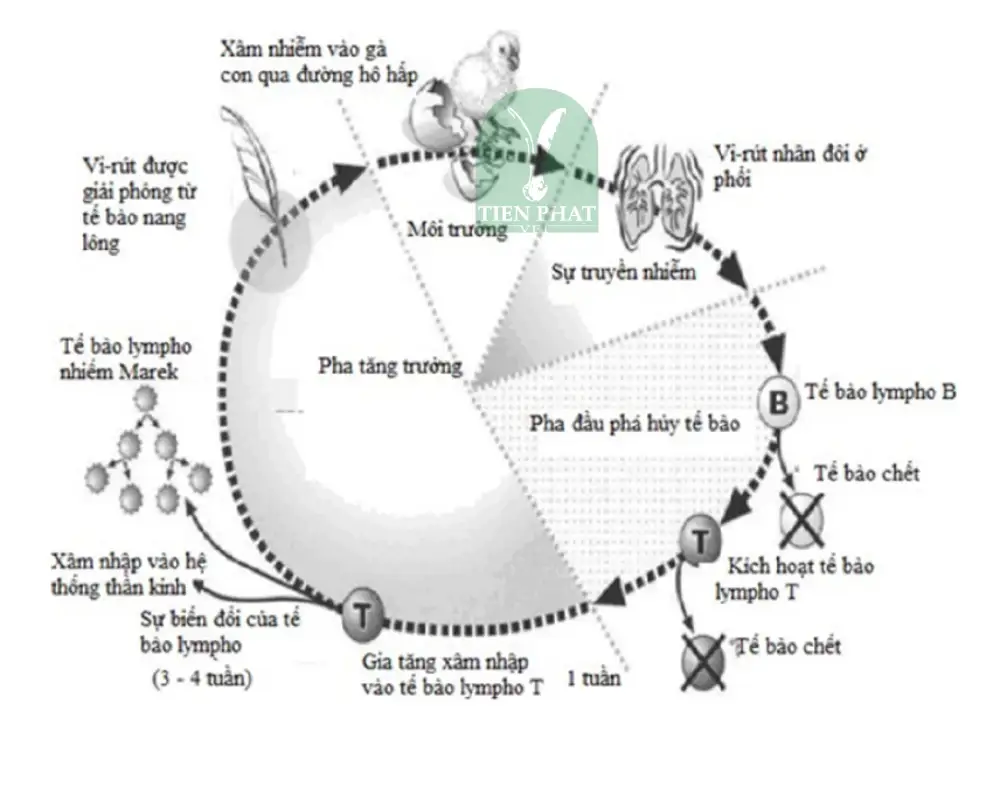 Sau khi xâm nhập vào cơ thể qua đường hô hấp, MDV nhân lên ban đầu trong các tế bào lympho tại mô lympho ngoại biên, gây ra giai đoạn nhiễm trùng sớm và suy giảm miễn dịch. Ở giai đoạn sau, virus gây chuyển dạng tế bào lympho, dẫn đến hình thành các khối u lympho ở nhiều cơ quan khác nhau.