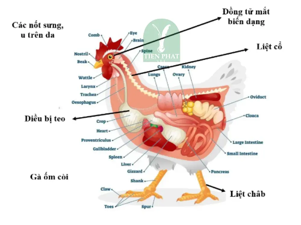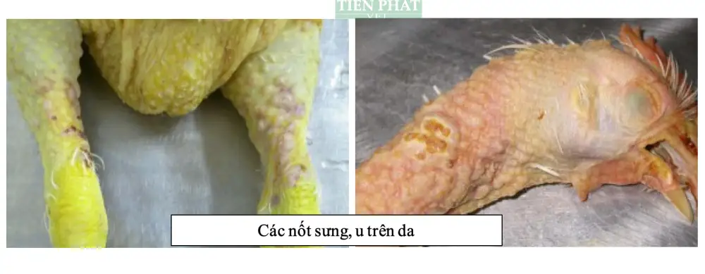 Thể thần kinh đặc trưng bởi liệt một hoặc hai chân, cánh xệ, cổ vẹo, dáng đi không vững. Ở thể u tạng, gà có thể chết đột ngột mà không có dấu hiệu rõ ràng trước đó.